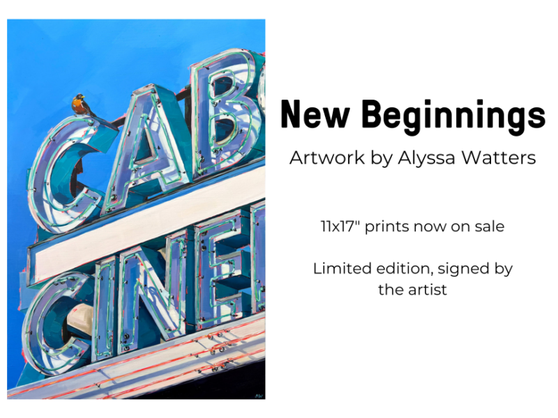 As we prepare to reverently say farewell to the 1960’s marquee, local artist Alyssa Watters has created a painting to mark this moment in time. Atop the letters is a robin—a symbol of new beginnings and good things to come. House of Roulx in Beverly has created gorgeous reproductions of the painting. These limited edition prints are 11×17” with each print signed by the artist. Get yours today!